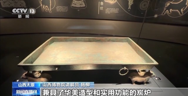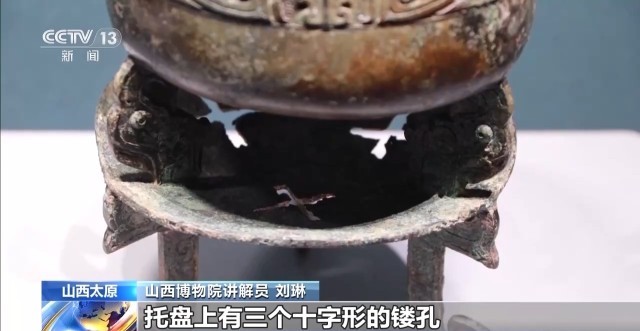 山西博物院讲解员 刘琳:在上方鼎的部分是用来盛放肉食的,而中间一层的托盘是用来盛放木炭,托盘上有三个十字形的镂孔,能起到很好的通风助燃以及把炭灰漏下去的效果。