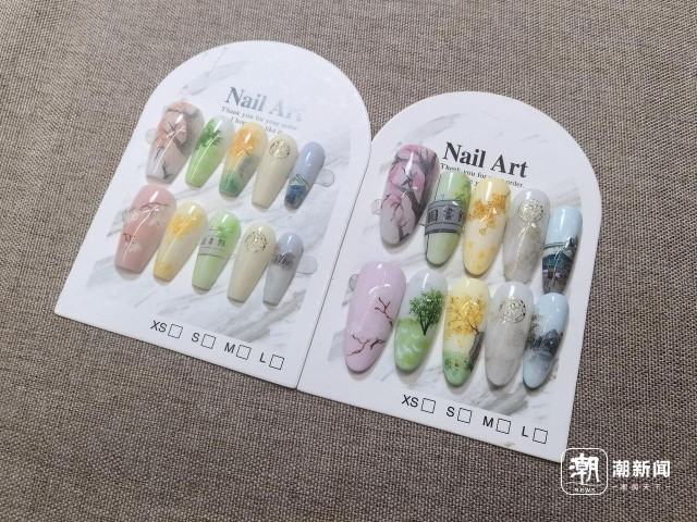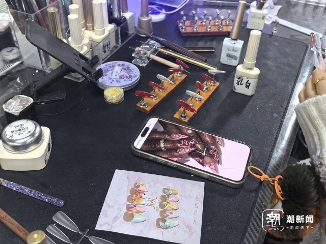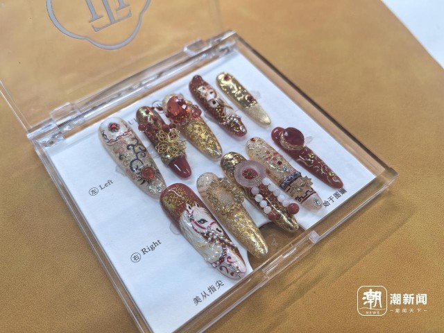 傍晚,在水晶城三号馆的图婳手工穿戴甲体验店内,几百款高端手工穿戴甲整齐陈列。店员取出一副“梅兰主题”手工穿戴甲。甲面上,工笔枝叶纤细如发丝,花瓣渐变自然。“纯手工绘制,一位师傅要做一天到一天半。”店员说。