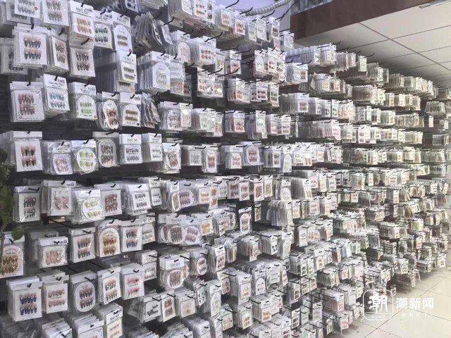 在离水晶城不远的艺禾穿戴美甲批发店,近160万副手工穿戴甲挂满墙壁。与图婳不同,艺禾主要走大众批发路线。企业在各乡镇有2000多名农村宝妈做代工,形成分散却稳定的生产网络。她们按件计酬,简单款一小时可做四五副。