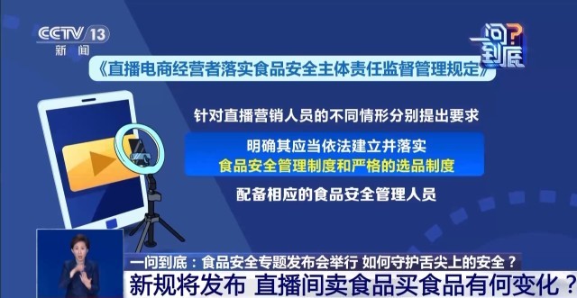 记者在发布会上了解到,《直播电商落实食品安全主体责任监督管理规定》已经走完审核审议流程,马上就要正式公布了。新规是如何规范主播、平台的食品安全责任的?以后在直播间买食品,再遇到临期、“三无”产品,维权是不是更方便了呢?