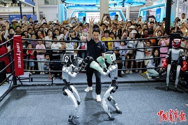 2025年8月10日,北京,2025世界机器人大会,来自各地的民众在观看一场人形机器人拳击赛。2025年全国两会,政府工作报告首次将“具身智能”和“智能机器人”写入这一年的重点工作。这一年被业界视为人形机器人商业化量产的“开端之年”。中青报·中青网记者 赵迪/摄