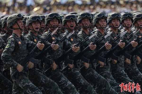 2025年9月3日,北京,受阅部队官兵喊着响亮的口号通过天安门广场,接受检阅。当日,中国以一场盛大阅兵纪念中国人民抗日战争暨世界反法西斯战争胜利80周年,来自人民军队各军兵种的受阅方队以严整的军容、雄壮的气势、昂扬的精神接受检阅。中青报·中青网记者 曲俊燕/摄