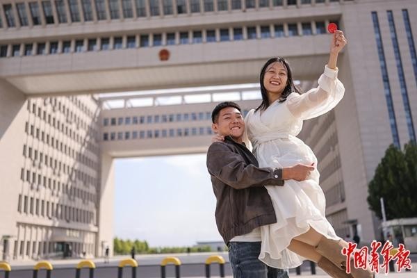 2025年9月9日,新疆伊犁哈萨克自治州霍尔果斯公路口岸第六代国门前,一对来自山西晋中的新婚夫妇手持“囍”字拍摄蜜月纪念照。这里是我国西部通关历史最长、综合运量最大、自然环境最好、功能最齐全的国家一类陆路口岸。除了承载繁忙的海关功能,这里还成为各地游客的旅游打卡点。中青报·中青网记者 曲俊燕/摄