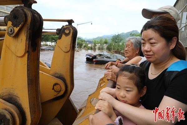 2025年7月28日,北京市密云区太师屯镇附近小区,在转移铲车上,小朋友偎依在母亲怀中,看着被山洪包围的自家小区。自7月23日8时至29日11时,北京在夏季迎来持续147个小时的强降雨。该轮强降雨的持续时间超过了2023年北京“23·7”极端强降水过程的83小时,导致包括密云、怀柔、平谷、延庆在内的北部山区受灾严重。中青报·中青网记者 陈剑/摄