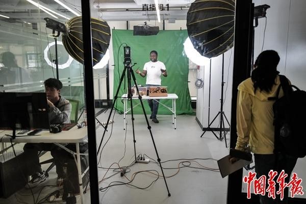 2025年9月22日,海南省海口市,来自尼日利亚的29岁小伙乌斯曼通过直播向全球卖货。这家公司聚焦美国及东南亚六国市场,希望通过跨境直播将海南的非遗、旅游文化、美妆、家居等产品推向国际舞台,单月最高销售额突破300万元。中青报·中青网记者 赵迪/摄