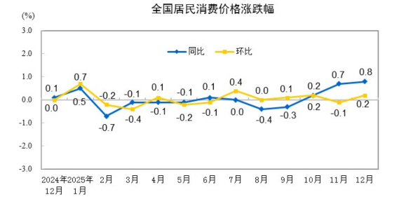 据国家统计局网站,2025年12月份,全国居民消费价格同比上涨0.8%。