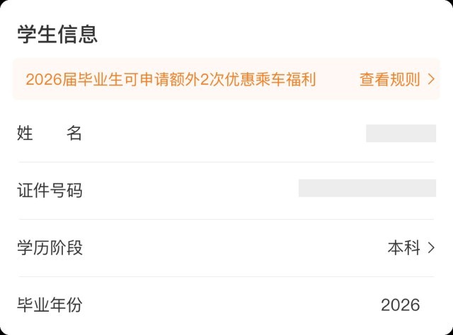 暂未在“学信网”核验的2026届毕业生可到车站窗口凭毕业生证明,线下办理资质采集核验,完成核验后,本学年可享受的单程学生优惠票,购票次数增至6次。