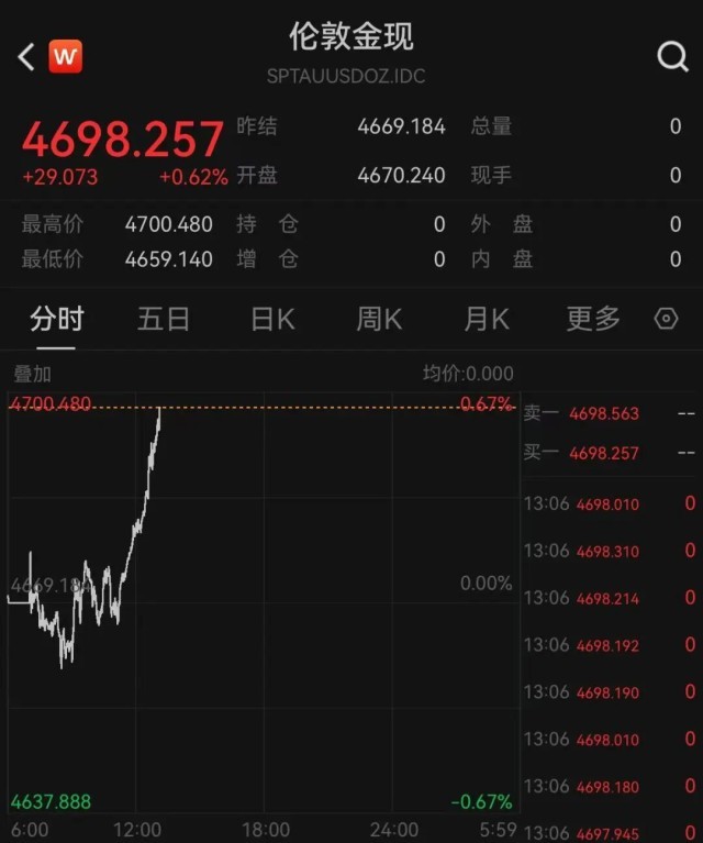 20日午后,现货黄金(伦敦金现)强势拉涨,盘中突破4700美元,再刷新历史新高。截至发稿,报4698.257美元/盎司,涨0.62%。