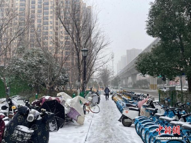 20日早上,武汉白雪纷飞,市民冒雪出行。马芙蓉 摄