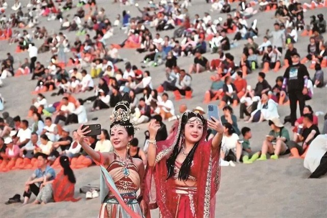 当暮色漫过鸣沙山的脊梁,晚风轻抚月牙泉的碧波,一场万名游客自发共唱的“落日合唱派对”在甘肃敦煌火热上演。大漠为幕布,沙丘为舞台,不但有手机电筒的“满山星光”,还有“生成式AI+多模态互动”技术联动线上线下,直播间数十万用户同步沉浸式参与,全网曝光量突破12亿次。