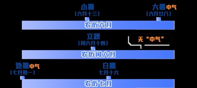 农历六月廿八已过大暑,处暑要农历七月初一才到来。两个“中气”间隔超一个月。因此,补上了闰六月。