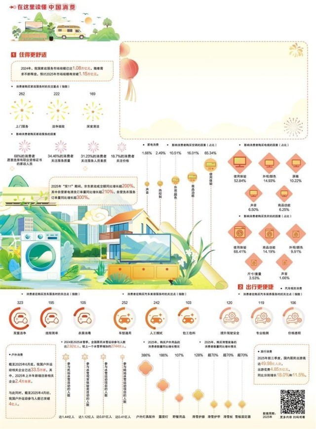 出行消费则告别“抵达即目的”的简单认知,提升出行体验成为消费者关注的焦点。2025年,随着观看演唱会、追逐体育赛事、体验非遗、短途旅行等多元出行需求的增长,越来越多消费者愿意为更好的出行体验付费——旅行包车、定制化出行等服务成交额增长亮眼;汽车相关消费则从单次购买转向长期服务绑定,消费者在保养时关注驾驶安全与专业检测,洗车时看重双重洁净与杀菌消毒,“商品+服务”一体化的体验模式越来越受欢迎,这意味着消费者更注重消费全周期的品质保障,也倒逼行业从产品销售向服务生态构建转型。