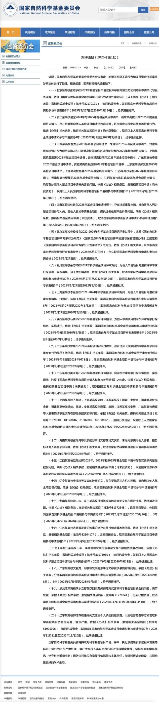 中国青年报客户端北京1月23日电(中青报·中青网记者 张茜)今天,国家自然科学基金委员会网站发布《案件通报(2026年第1批)》,该通报显示,近期对相关科研不端行为和项目资金违规案件涉事主体进行了处理。