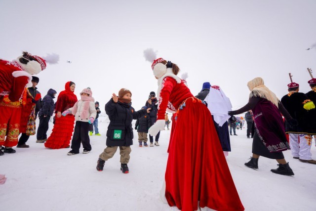 牧民在新疆昭苏县湿地公园为游客展示非遗“姑娘追”。新华社记者 胡虎虎 摄
