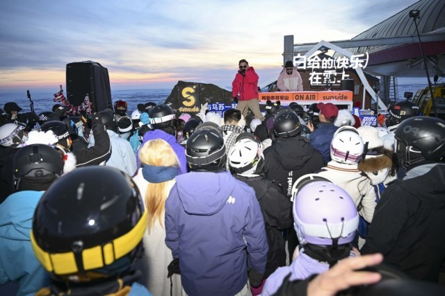 雪友在新疆阿勒泰将军山国际滑雪度假区参加“夕阳派对”。新华社记者 胡虎虎 摄