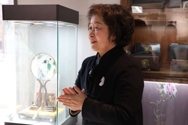 1月22日,国家级非物质文化遗产代表性项目苏绣(无锡精微绣)代表性传承人赵红育正在介绍精微绣。苏州大学 周柳/摄
