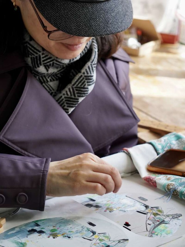 赵红育的弟子正全神贯注复刻2025年春晚同款的刺绣作品。这幅作品以吴冠中画作为原型,以无锡古运河为灵感。扬州大学 章依婷/摄