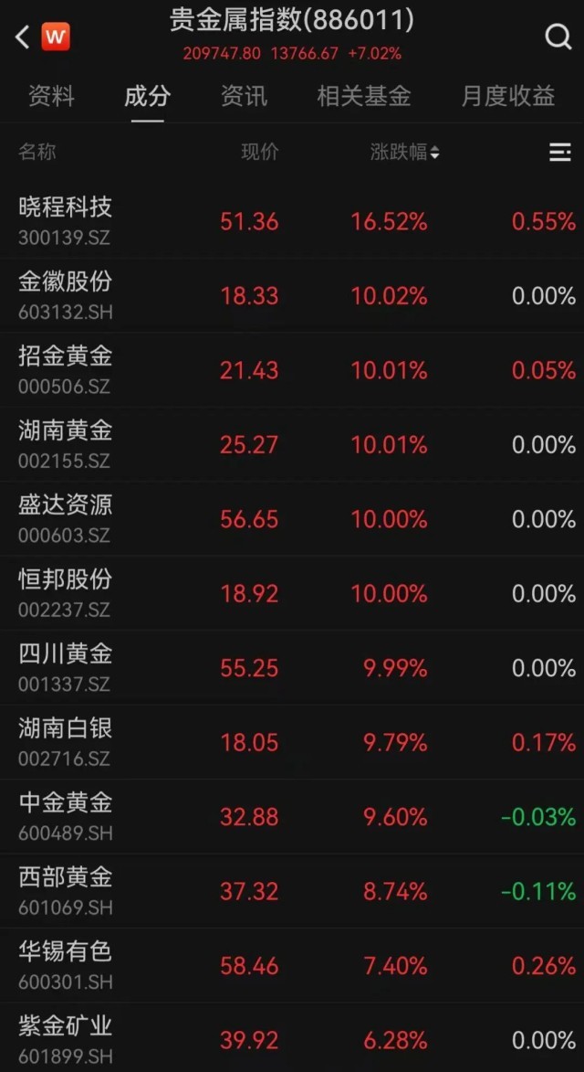 26日,黄金股集体大涨,截至午盘,招金黄金、湖南黄金、盛达资源、恒邦股份、四川黄金均涨停,晓程科技涨超16%,中金黄金、山东黄金等大幅跟涨。