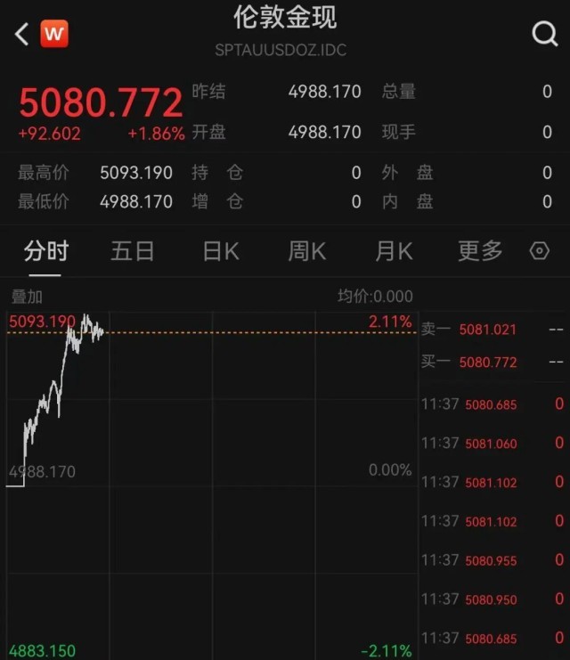黄金价格在2025年大幅上涨,进入2026年也未停下脚步。今日稍早,现货黄金历史首次突破5000美元大关;盘中最高冲至5093美元,涨幅超2%。
