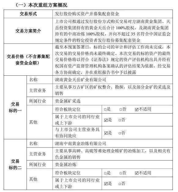 25日,湖南黄金披露,拟通过发行股份方式购买交易对方湖南黄金集团、天岳投资集团持有的湖南黄金天岳矿业有限公司(下称“黄金天岳”)合计100%股权,及湖南黄金集团持有的湖南中南黄金冶炼有限公司(下称“中南冶炼”)100%股权,并向不超过35名符合中国证监会规定条件的特定投资者发行股份募集配套资金。