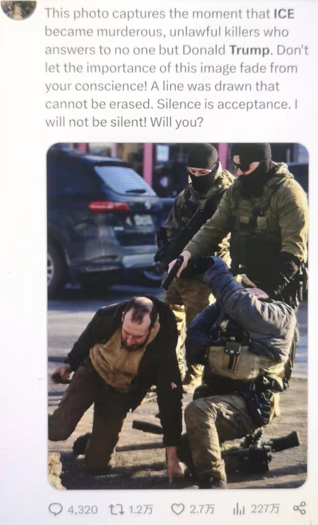 有网友评论:“这张照片定格了ICE沦为杀人凶手、非法杀戮者的瞬间,他们只听命于特朗普。不要让这张照片的意义从你的良知中淡去!一条无法抹去的界线已被划下。沉默即是默许。我不会保持沉默!你呢?”社交媒体平台“X”截图