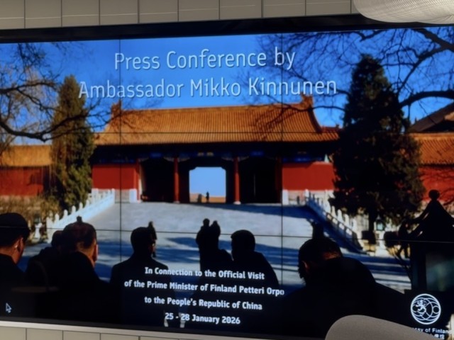 1月25日至28日,芬兰总理奥尔波对中国进行正式访问,这是自2017年以来芬兰总理首次访问中国。28日下午,明凯从机场送别奥尔波后,赶回芬兰驻华大使馆举办中国媒体见面会,介绍奥尔波此次访华的成果。