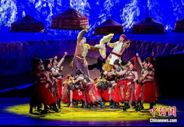 2023年4月7日,新疆乌鲁木齐,原创歌舞剧《玛纳斯》作为首届新疆文化艺术节优秀剧目在新疆人民剧场上演。中新社记者 刘新 摄
