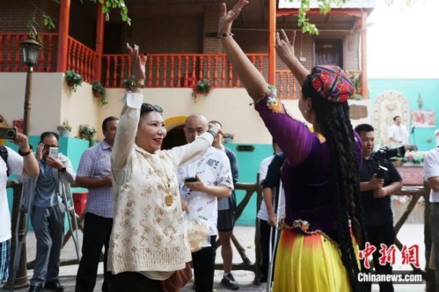 2025年9月10日,新疆吐鲁番坎儿井民俗园景区,游客与表演者共舞。中新社记者 王紫儒 摄