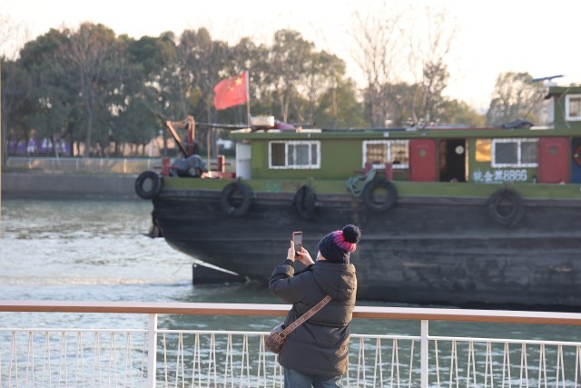 市民在沿河步道上拍摄河流上过往船只。苏州大学 周柳/摄