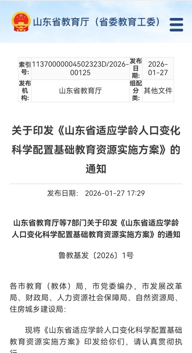 《山东省适应学龄人口变化科学配置基础教育资源实施方案》。(山东省教育厅供图)