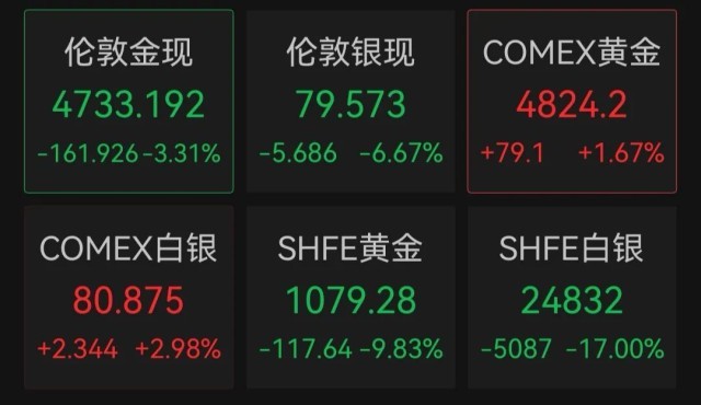 周一开盘,金银价继续大跌。截至发稿,现货黄金日内跌3.31%,报4733.192美元/盎司。现货白银日内跌6.67%,报79.573美元/盎司。