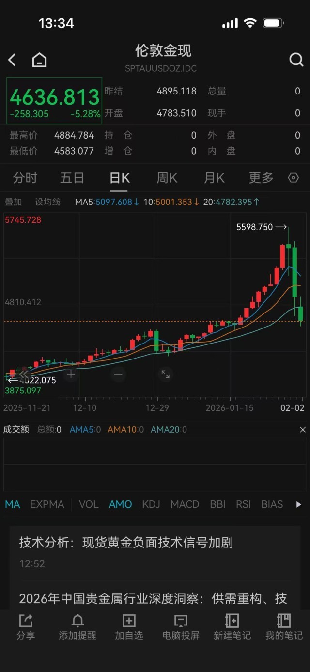 截至发稿时,现货黄金价格跌超5%,交投于4636美元/盎司附近。
