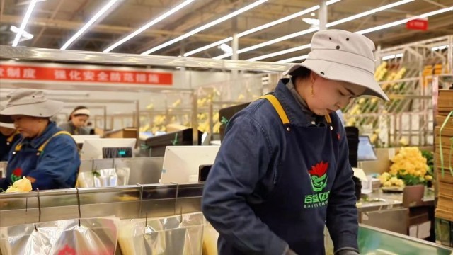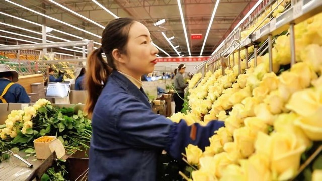 女工在车间包装玫瑰