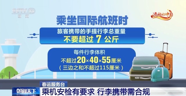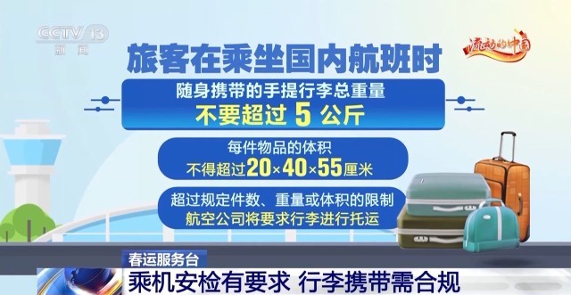旅客在乘坐国内航班时,随身携带的手提行李总重量不要超过5公斤,每件物品的体积不得超过20×40×55厘米,超过规定件数、重量或体积的限制,航空公司将要求行李进行托运。