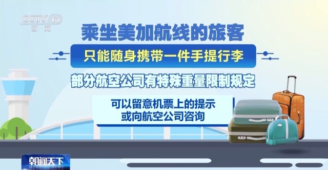 乘坐美加航线的旅客只能随身携带一件手提行李。部分航空公司有特殊重量限制规定,可以留意机票上的提示,或向航空公司咨询。