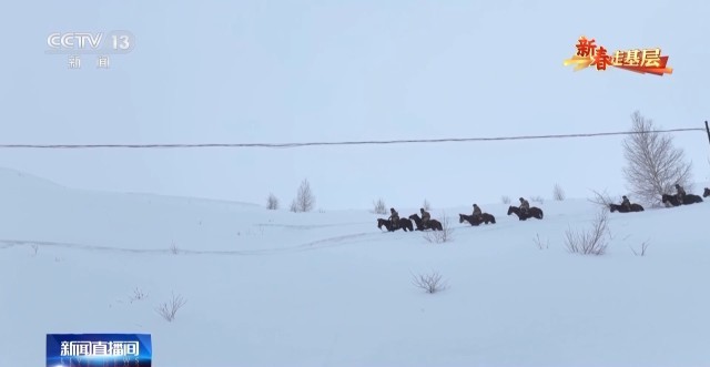 总台央视记者 刘洁:官兵们正在进行骑马巡逻的准备,每匹军马都系上了鲜艳的红头绳,给冬日的边关带来了暖暖的年味。这些军马是官兵们巡逻途中最亲密的战友,今天他们再一次踏上边防巡逻路,用坚守迎接新春。