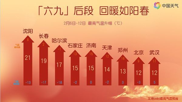 中国天气网讯 随着寒潮深入影响我国,今明天(2月6日至7日)南北方大部都将感受到不同程度的寒意,华北、黄淮一带最高气温在0℃上下,长江中下游一带最高气温也只有5℃左右。而在短暂降温之后,南北方又将掀起一波大回暖,多地累计升温幅度将超过10℃,在“六九”后期,回暖如阳春,江南多地还有可能开启入春进程。