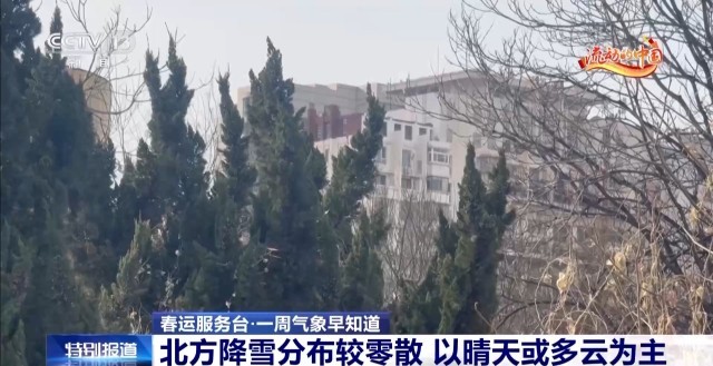 在北方,本周降雪分布比较零散,天气是以晴天或多云为主,需要注意的是今明两天会有弱冷空气影响,给华北东北等地带来4~8℃的降温。此外,像西北地区也是多风的天气,像今天新疆、甘肃北部还有青海、宁夏北部,就会有5~7级的风,阵风可达8~9级。