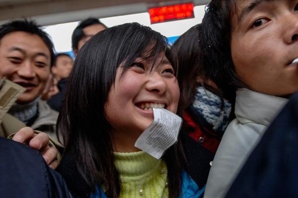 2008年1月19日,安徽合肥火车站,一个女孩衔着火车票上车。吴芳/摄