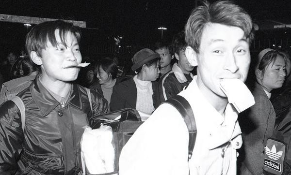 1999年春运,广东广州火车站广场,年轻人嘴里衔着车票排队进站。邓勃/摄