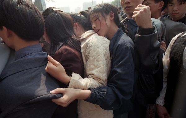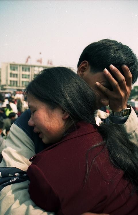 1999年春运,广东广州火车站广场,春节返乡途中,一对年轻夫妻抱在一起哭泣——他们被偷了,行李还在,钱没有了,连车票都被偷走了。邓勃/摄