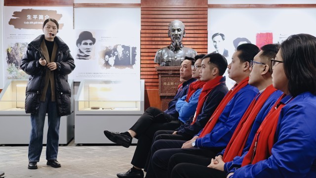 2月9日,中央团校马克思主义学院教师黄陈晨(左一)在柳州市胡志明旧居,为越南青年代表讲授《胡志明在中国》。中青报·中青网记者 谢洋/摄