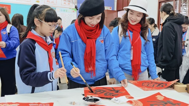 2月9日,柳州市鱼峰山小学,越南青年代表和小学生共同书写福字,感受中国年味。中青报·中青网记者 谢洋/摄