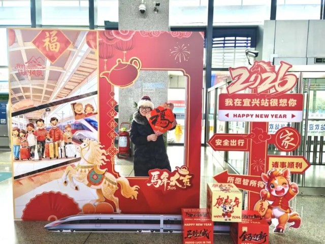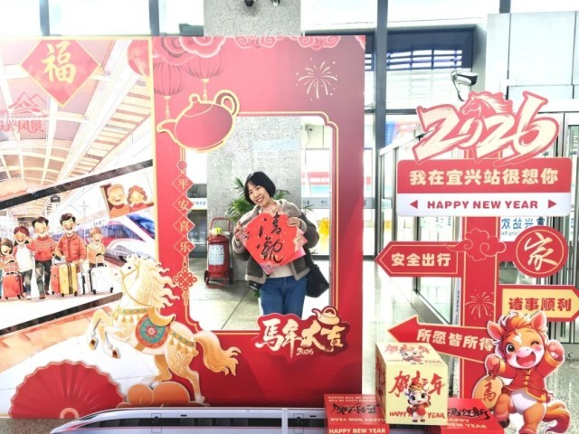 旅客在宜兴站拿着“福”字拍照打卡。