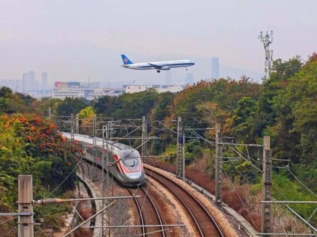 厦门岛内鹰厦线路上,红色复兴号与蓝色飞机同框。