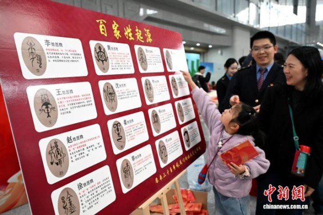 来自河南的旅客李望带着孩子在“百家姓甲骨文起源文化”展板前认真了解李姓的起源与文化,李望表示,希望让孩子了解“李”姓的起源,明白“不忘本、知溯源”的意义,这与春节团圆溯源的内涵不谋而合。他认为,通过活动的形式让孩子直观感受中华姓氏文化的深厚底蕴,十分有意义。