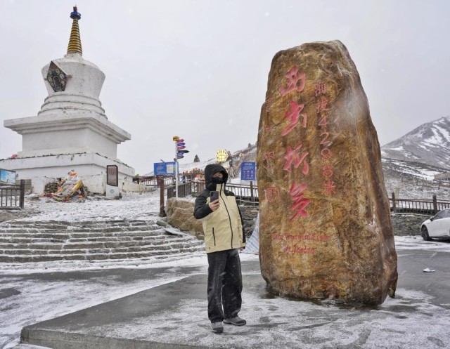 1月30日,游客正在折多山垭口处“西出折多”碑前打卡拍照。新华社记者刘坤 摄