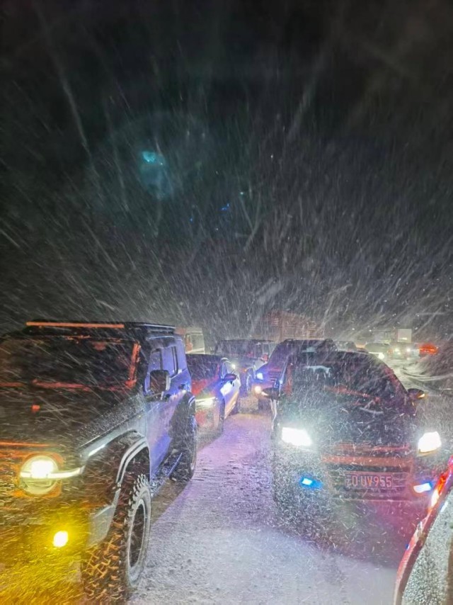 去年11月1日深夜,记者就曾被困折多山上2个多小时,一行人从甘孜州乡城县自西向东全天赶路,原打算翻过折多山在康定入住。没想到上山时,就迎来疾雪——密集的雪花夹着风,隐约能听见直击挡风玻璃的声音。许多大货车在“多”字状的山路上排起长队,沿途还常看到因耗尽电能而“趴窝”的新能源车,车身上积起几寸厚的雪。