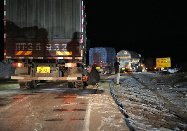 1月30日晚的这场大雪,依然来得突然。不少车辆都靠边停车安装防滑链,一对开罐车的夫妻蹲在车轮旁反复测试防滑链是否拉紧。经常翻越折多山的这对夫妻说:“下午在康定还是晴天,不过走折多山,防滑链是必备品。”
