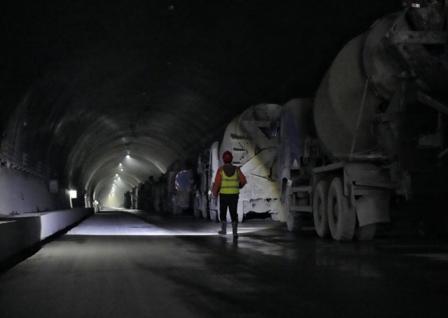 工人们在折多山隧道内巡查。新华社记者刘坤 摄